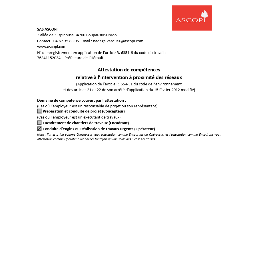 ASCOPI est agréé centre d’examen AIPR par le ministère de la transition écologique, nous délivrons donc l’attestation de compétences à nos stagiaires après passage de l’examen QCM / AIPR. voir exemple de modèle ci dessous